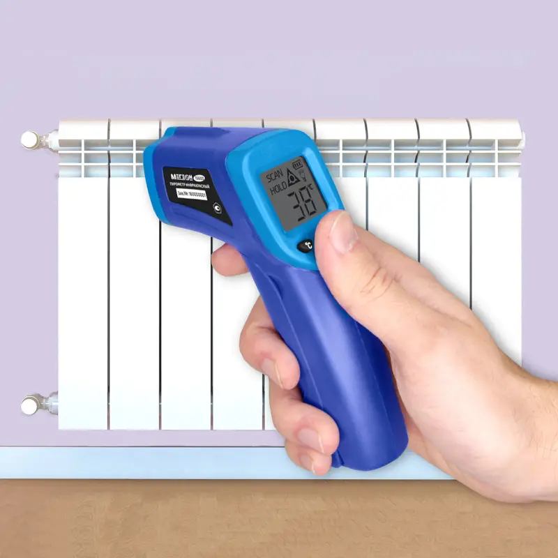 Рабочий спектральный диапазон прибора составляет от 8 до 14 микрометров, что соответствует типичному диапазону теплового излучения большинства материалов. Предустановленный коэффициент излучения равен 0,95, что оптимально для большинства бытовых и промышленных поверхностей, и избавляет пользователя от необходимости вручную настраивать прибор под разные объекты. Оптическое разрешение 12:1 означает, что с расстояния 12 см можно измерять температуру объекта диаметром 1 см, что повышает точность в работе с мелкими или удалёнными элементами.