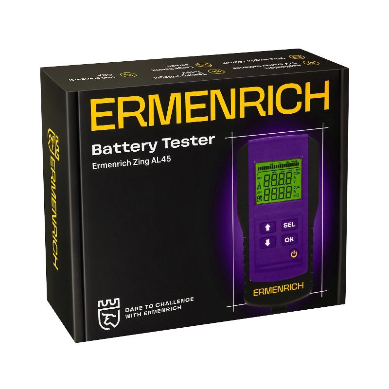 Тестер Ermenrich Zing AL45 предназначен для диагностики автомобильных аккумуляторов и источников бесперебойного питания (ИБП). Прибор измеряет ключевые параметры: напряжение, ток холодного пуска (ССА) и внутреннее сопротивление, отображая результаты на ЖК‑экране.